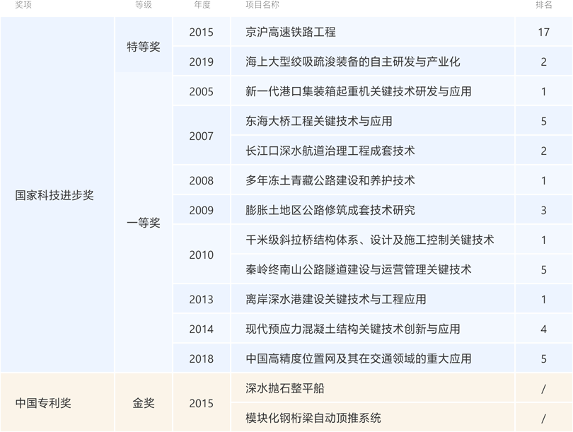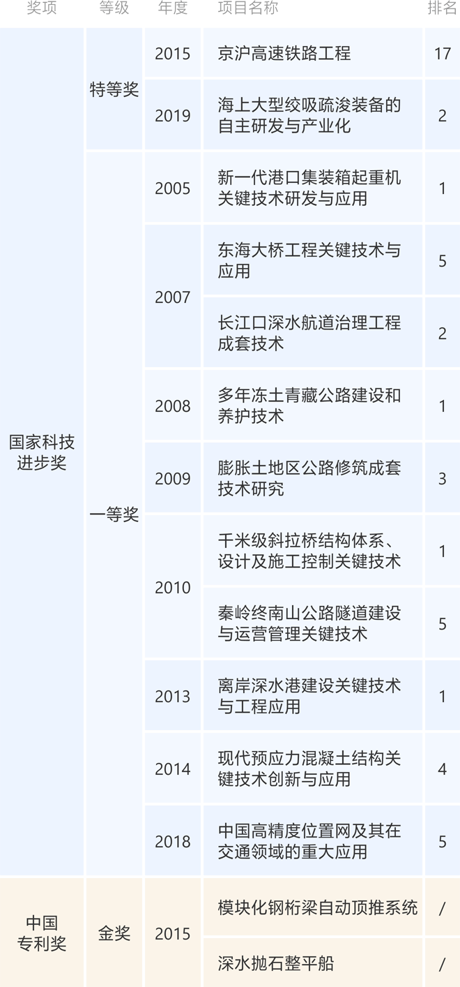 截至2021年底,公司获得国家科技进步奖特等奖2项,一等奖10项,二等奖34项;国家技术发明奖二等奖5项。中国专利奖金奖2项,优秀奖34项。詹天佑奖108项。