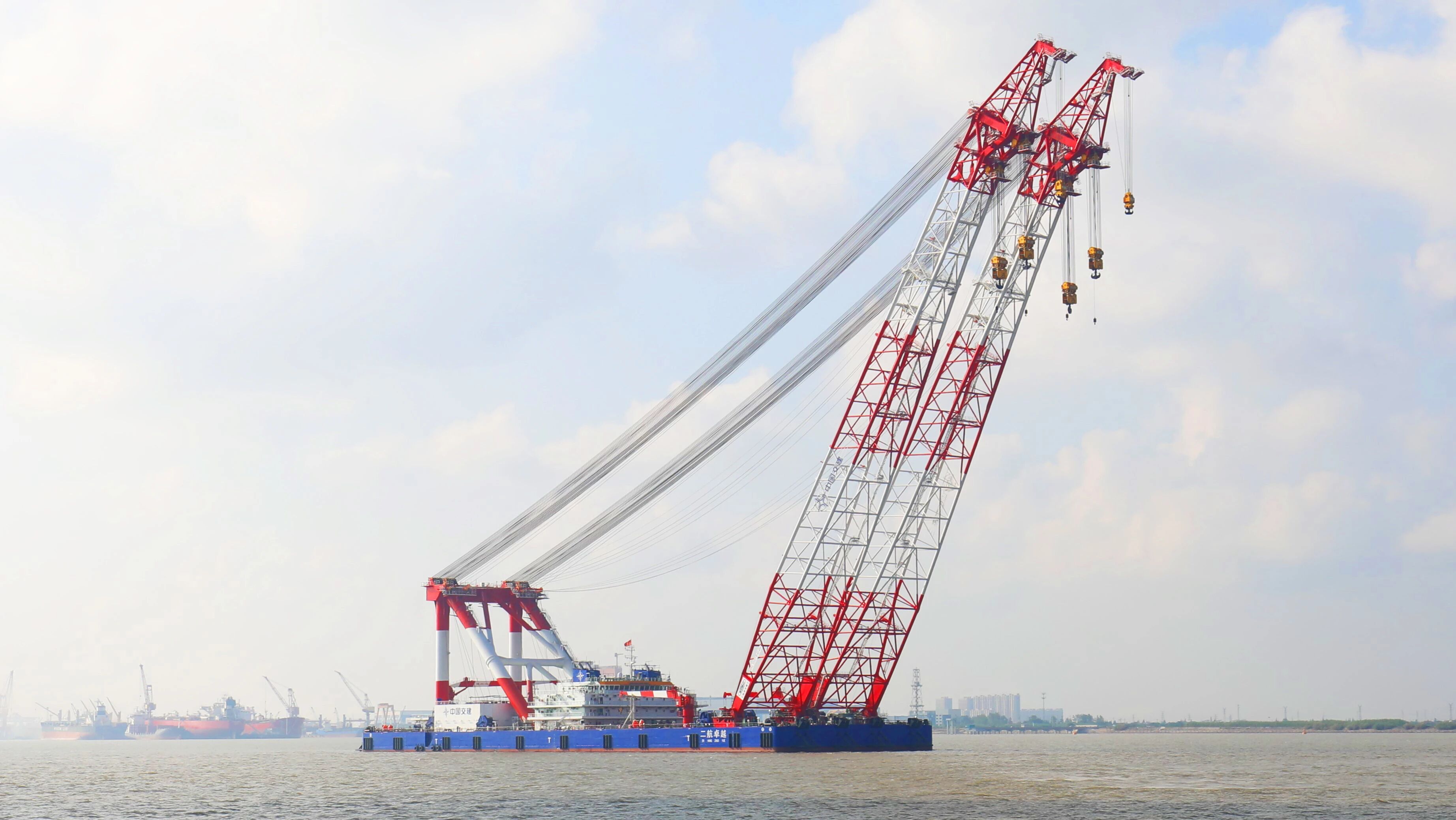 该船船长165米、型宽52米、型深11米,是国内最大5500吨双臂架变幅式起重船,配备8点锚泊定位系统,最大起升高度为水面以上120米。该船搭载自主设计的超大吨位双臂架系统,实现5500吨联合起重能力,具备精密同步控制、强结构刚度和抗风浪稳定性,成功打破超大型海上构件吊装的瓶颈,标志着我国在高端海洋工程装备研发制造领域实现了历史性跨越,并刷新了国内双臂架起重船的多项纪录,彰显了中国在超大型智能化海洋工程装备领域的综合实力和创新能力。