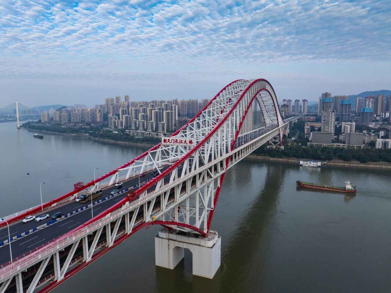 重庆朝天门大桥位于重庆市主城区内、长江与嘉陵江交汇处朝天门下游1.7公里,横跨长江,西连江北区青草坝,东接南岸区弹子石,是连接重庆中央商务区内的一座标志性大桥。主桥长932米,主跨为三跨连续中承式钢桁系杆拱桥。主桥设上下双层桥面,上层桥面为双向6车道,宽3米,下层桥面宽23.2米,主要为轨道交通通行。