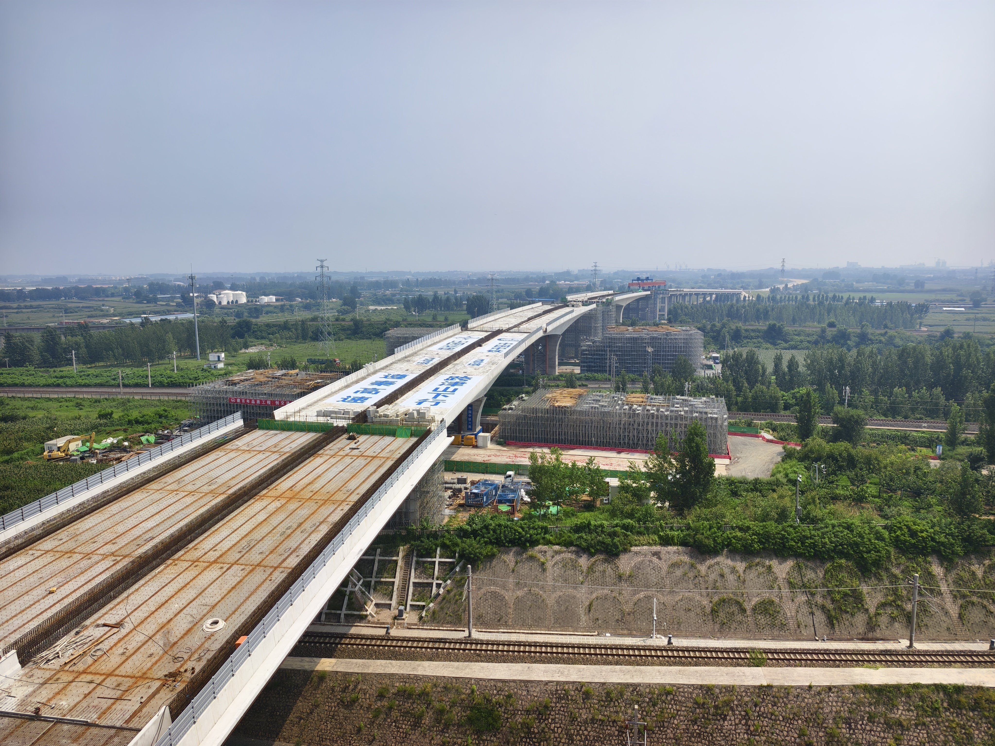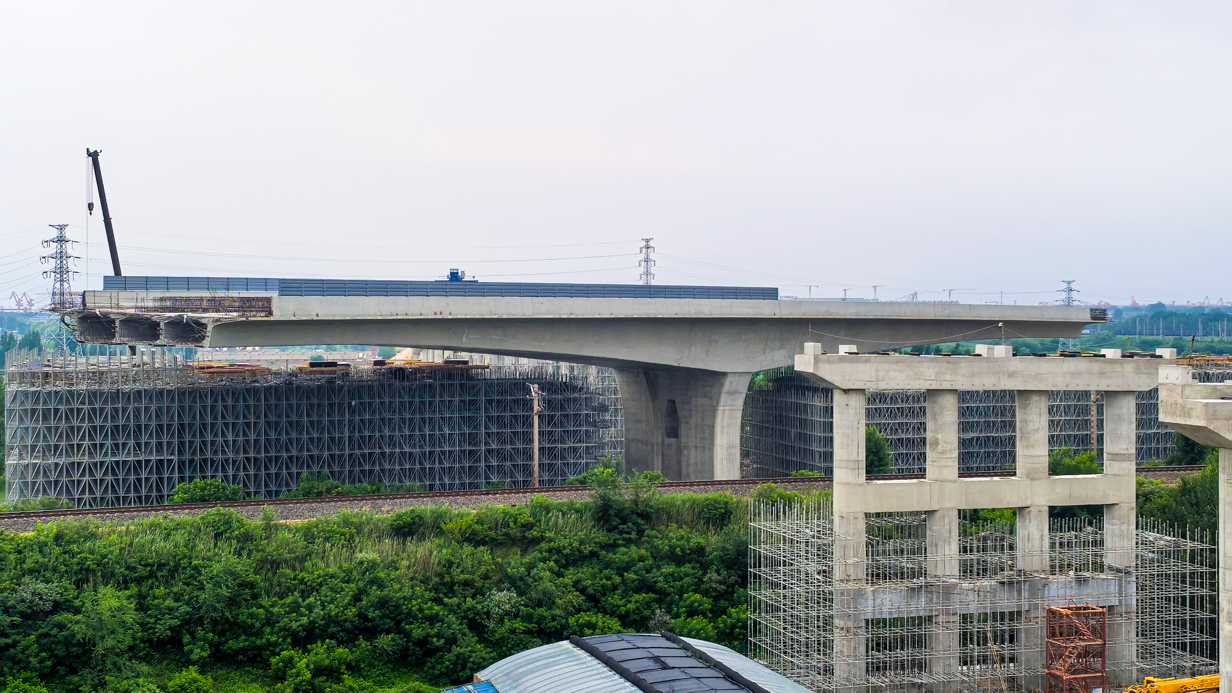 京哈铁路大桥位于天下第一关——山海关前,是项目的核心控制性工程,大桥全长652米,需上跨京哈高铁、津山铁路、龙山联络线3条铁路线共计6股道。为不影响既有铁路正常行车,保证施工安全,大桥共设计有4个转体梁,是河北省在建的最大规模转体工程。4座桥梁总重超4.7万吨,相当于4.7座艾菲尔铁塔重量,且桥下平均每4分钟通过一趟列车,每天约有400趟列车经过,要将4个庞然大物在有限时间窗口内平稳、精确地转动到位,难度堪比“绣花”。