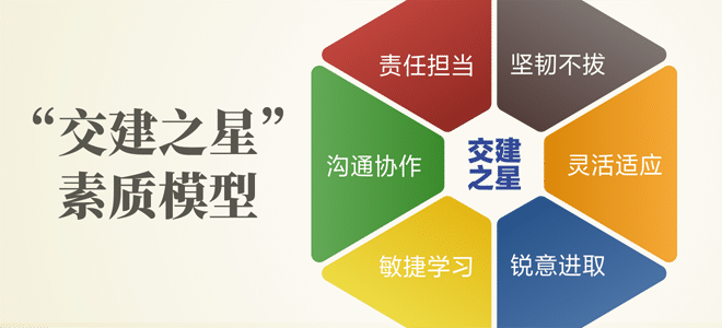 建立“交建之星”素质模型(六有素质、六色品格),即“责任担当”“沟通协作”“敏捷学习”“锐意进取”“灵活适应”“坚韧不拔”等6个维度的胜任能力,打造公司校园人才通用标准,用以辅助甄选与识别优秀毕业生。