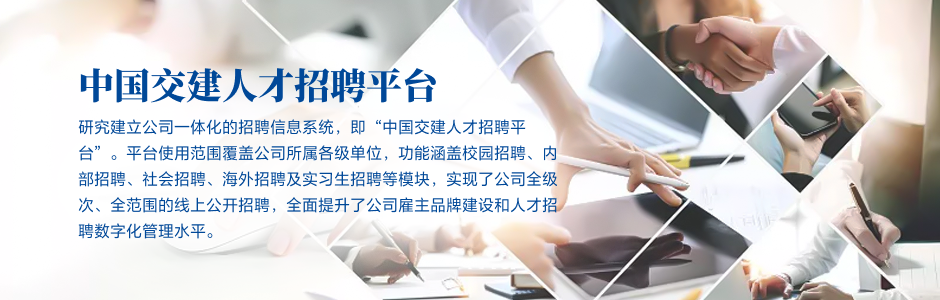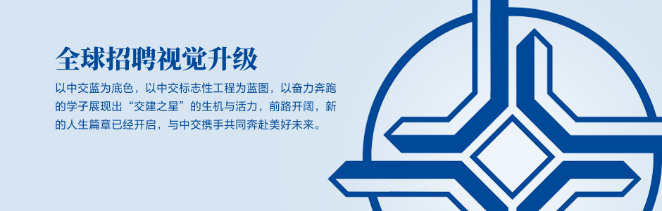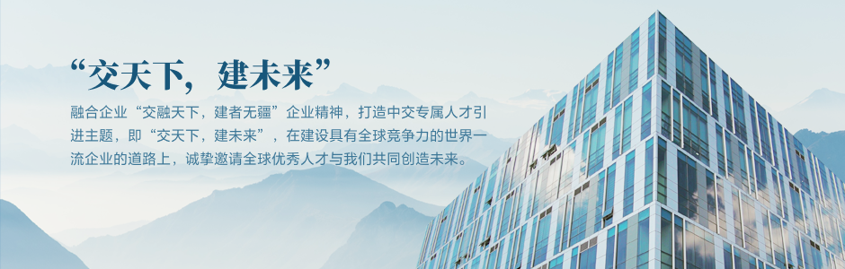融合企业“交融天下,建者无疆”企业精神,打造中交专属人才引进主题,即“交天下,建未来”,在建设具有全球竞争力的世界一流企业的道路上,诚挚邀请全球优秀人才与我们共同创造未来。