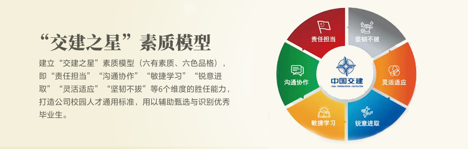 建立“交建之星”素质模型(六有素质、六色品格),即“责任担当”“沟通协作”“敏捷学习”“锐意进取”“灵活适应”“坚韧不拔”等6个维度的胜任能力,打造公司校园人才通用标准,用以辅助甄选与识别优秀毕业生。