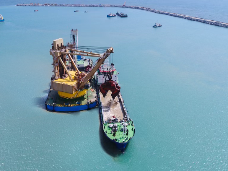 “金广”轮抓斗船是目前世界上最大的非自航抓斗式挖泥船,堪称“淤泥搬运界的超级网红”。“金广”轮长100米,宽36米,高45米,配有200立方米方及170立方米两套挖泥抓斗,最大旋转半径31米,最大挖深30米,重机最大吊重690吨。