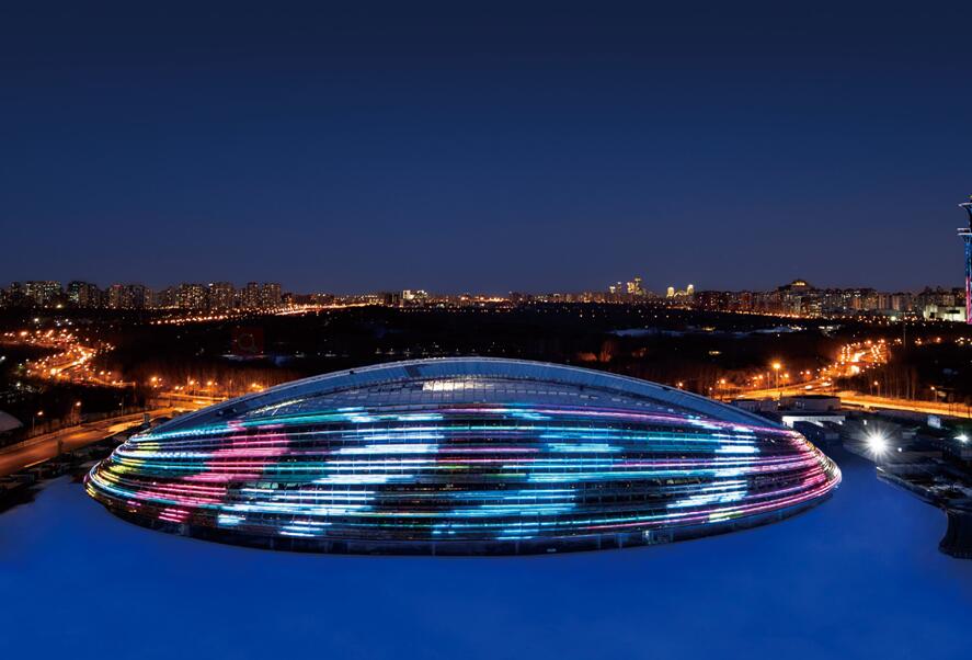 2022 年北京冬奥会标志性场馆——国家速滑馆的 22 条“冰丝带”创意光影秀。
