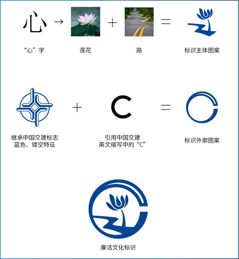 标识主色为中交蓝,标识中间为由“心”字抽象变形的莲花形象,突出“心至廉”,寓意清正廉洁,出淤泥而不染;莲花下方一条平坦的道路延伸向远方,突出“路致远”,象征公司“固基修道,履方致远”的企业使命;标识外部轮廓由司标演变而成,包裹着莲与路,象征公司全体干部职工秉清正廉洁之心、走行稳致远之路。