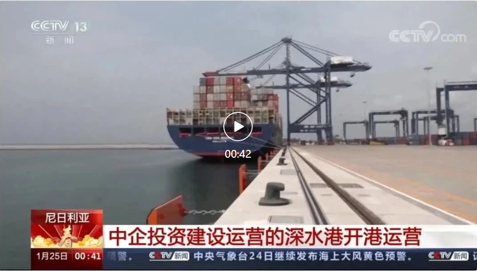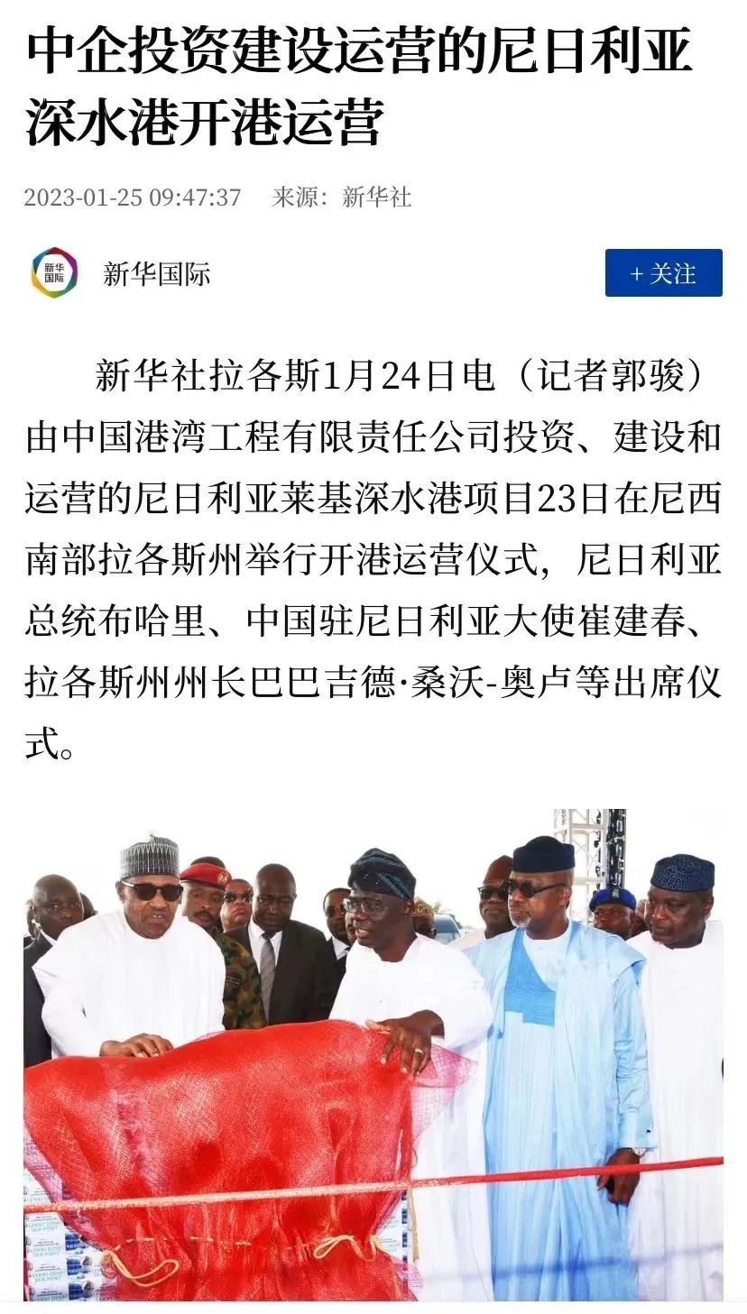 1月24日,新华社刊文《中企投资建设运营的尼日利亚深水港开港运营》,报道由中国港湾投资建设运营的尼日利亚莱基深水港开港运营。