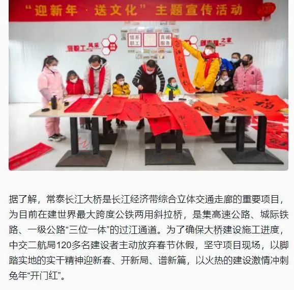 1月20日,央视新闻客户端专题报道由二航局承建的江苏常泰长江大桥项目,讲述120多名建设者主动放弃春节休假,坚守项目现场,以火热的建设激情冲刺兔年“开门红”。