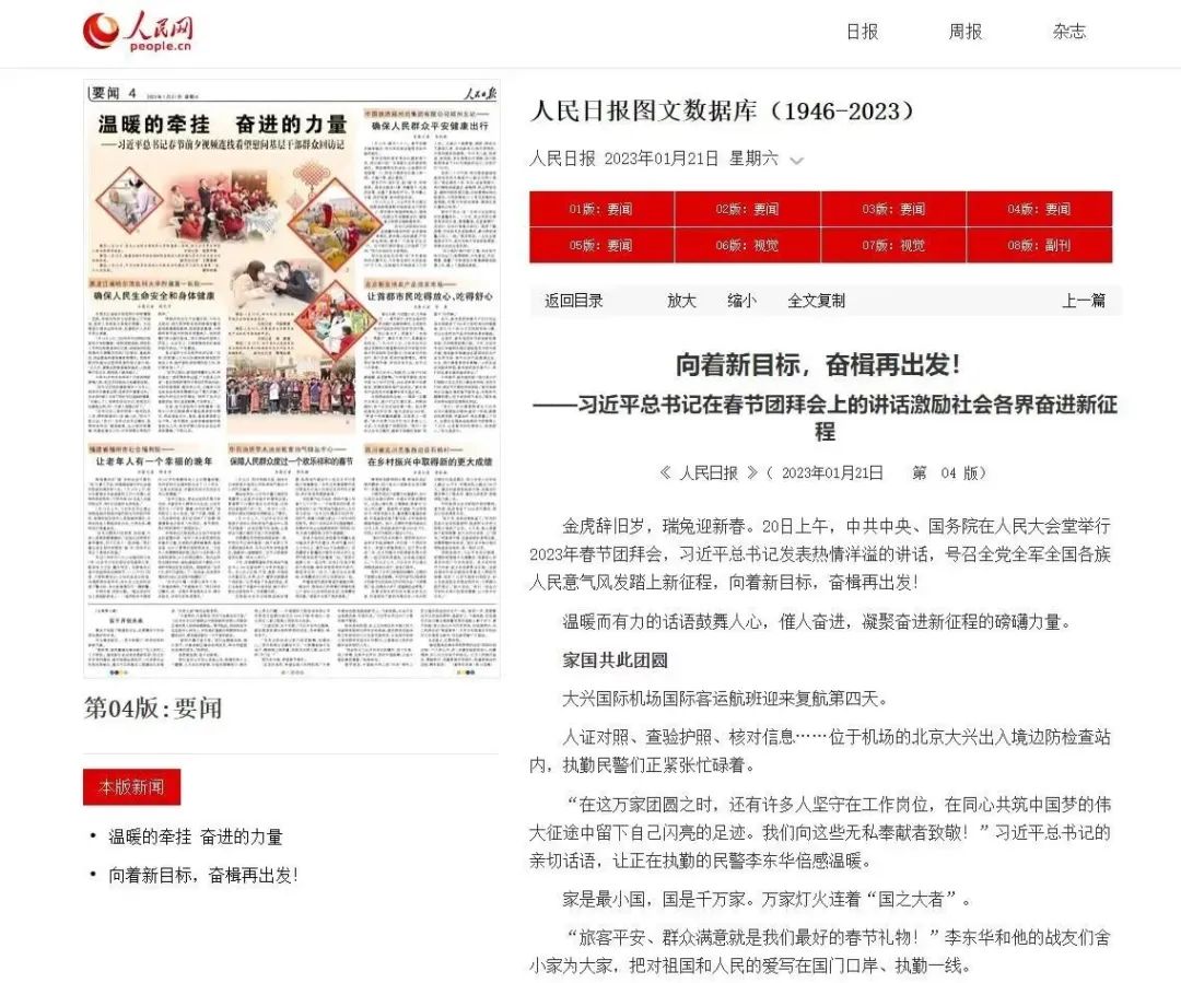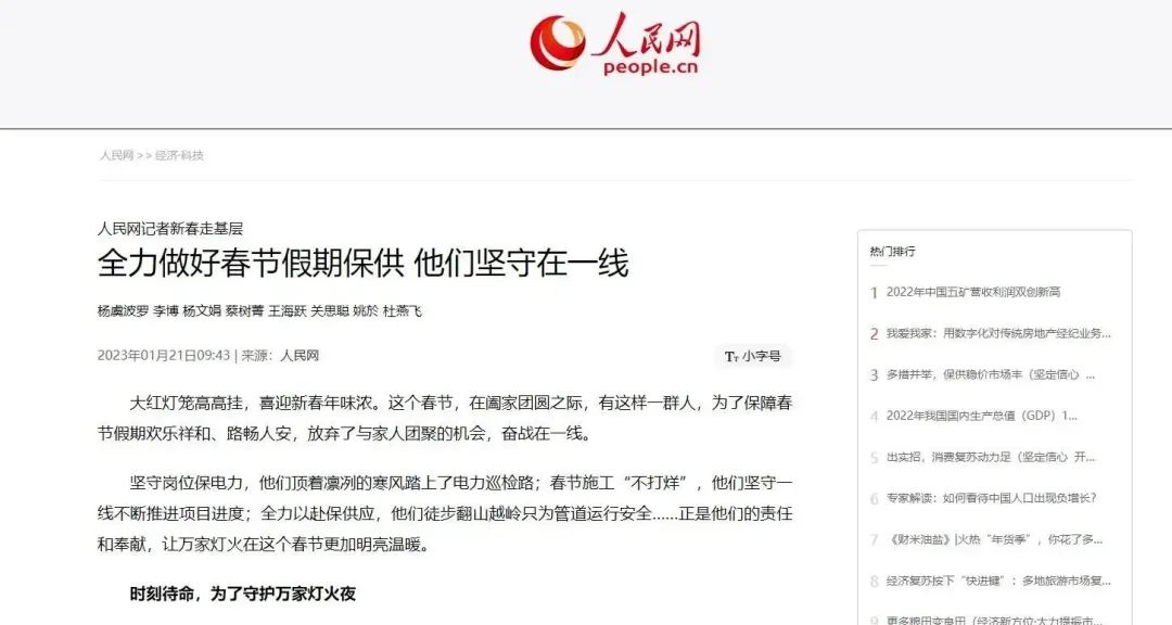 1月21日,人民网刊文《全力做好春节假期保供 他们坚守在一线》,报道一公局集团北京东六环项目员工春节坚守岗位,保障“运河号”盾构机正常运转。