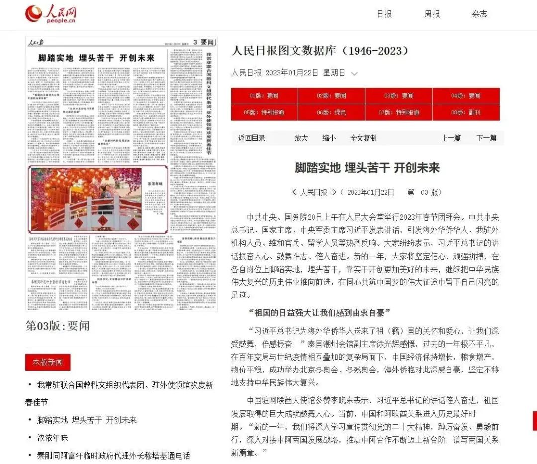 1月22日出版的《人民日报》刊文《脚踏实地 埋头苦干 开创未来》,报道中国路桥中东欧建设者代表受到习近平总书记在春节团拜会上的讲话鼓舞,将以高标准、可持续、惠民生为目标扎实推进相关项目建设,为中外友好合作不断作出新的贡献。