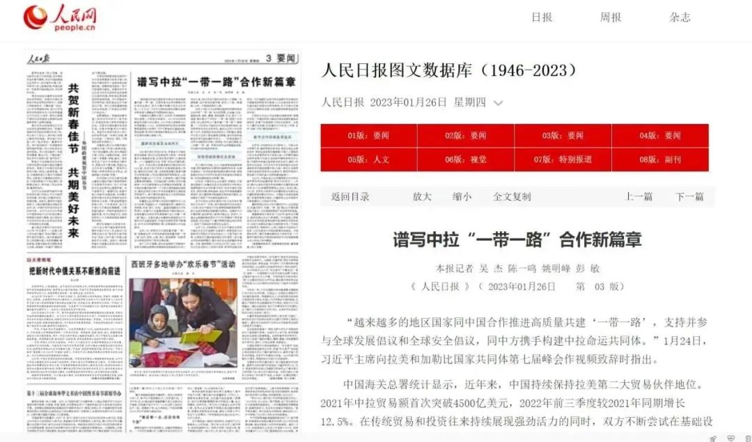 1月26日出版的《人民日报》刊文《谱写中拉“一带一路”合作新篇章》,报道由中国港湾、四航局承建的秘鲁钱凯港,建成后将成为南太平洋沿岸重要的交通枢纽和物流中心,极大便利秘鲁的进出口贸易和地区发展。