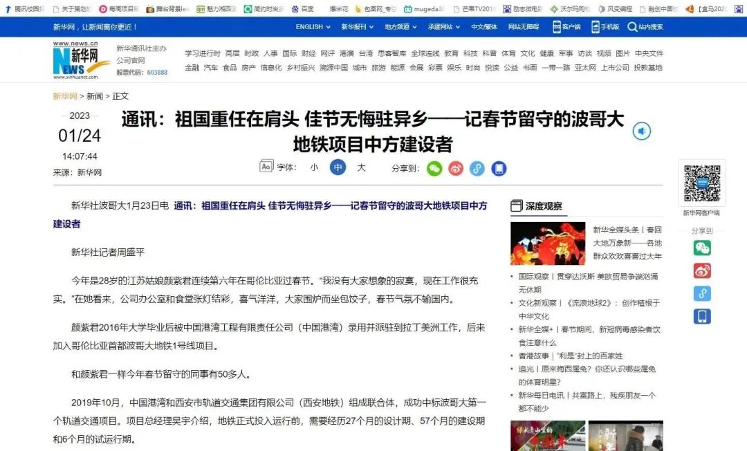 1月24日,新华社刊文《祖国重任在肩头 佳节无悔驻异乡——记春节留守的波哥大地铁项目中方建设者》,报道中国港湾波哥大地铁项目50多名中方建设者坚守海外、就地过年。