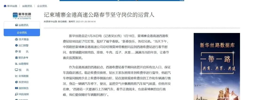 1月26日,新华丝路刊文《记柬埔寨金港高速公路春节坚守岗位的运营人》,报道中国路桥工作人员春节期间坚守海外,保障柬埔寨金港高速通行安全。