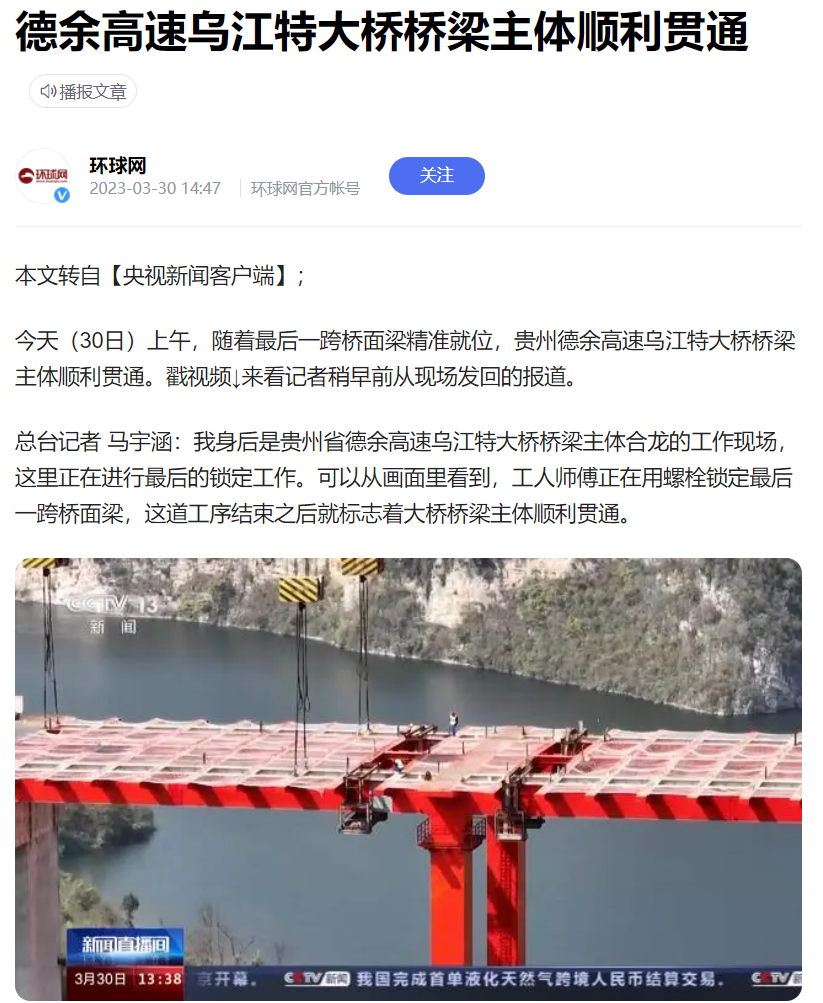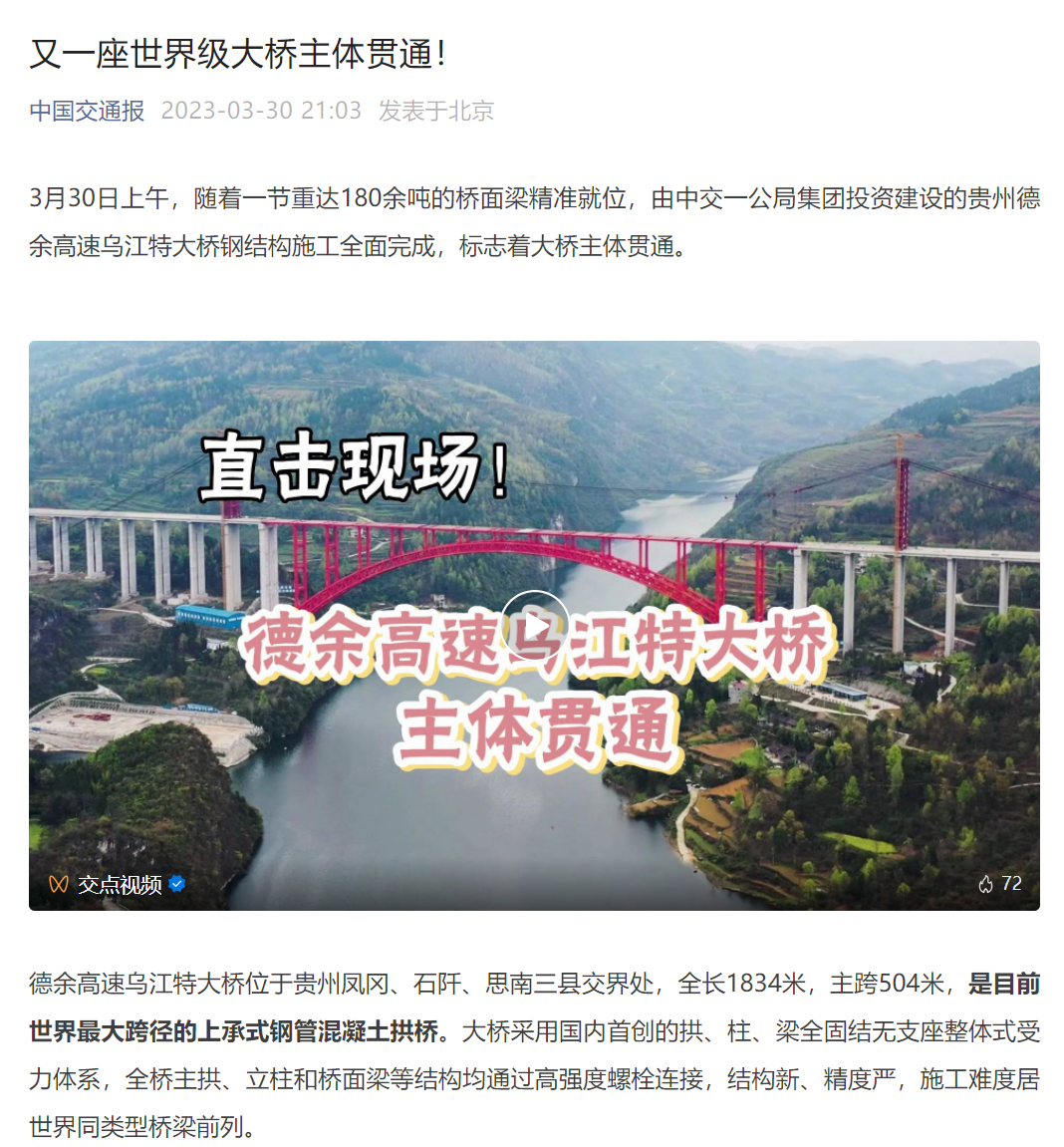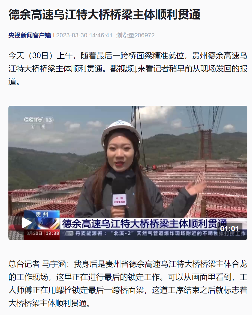 贯通直播共吸引200余万网友围观互动,20余家主流媒体转载乌江特大桥主体贯通消息,中交“出品”的超级工程再次刷屏全网。