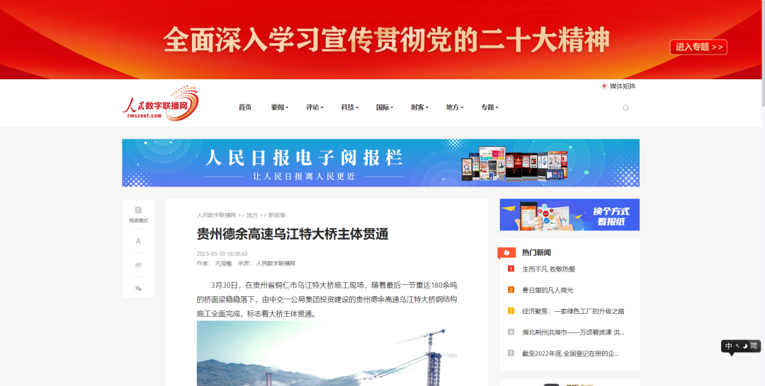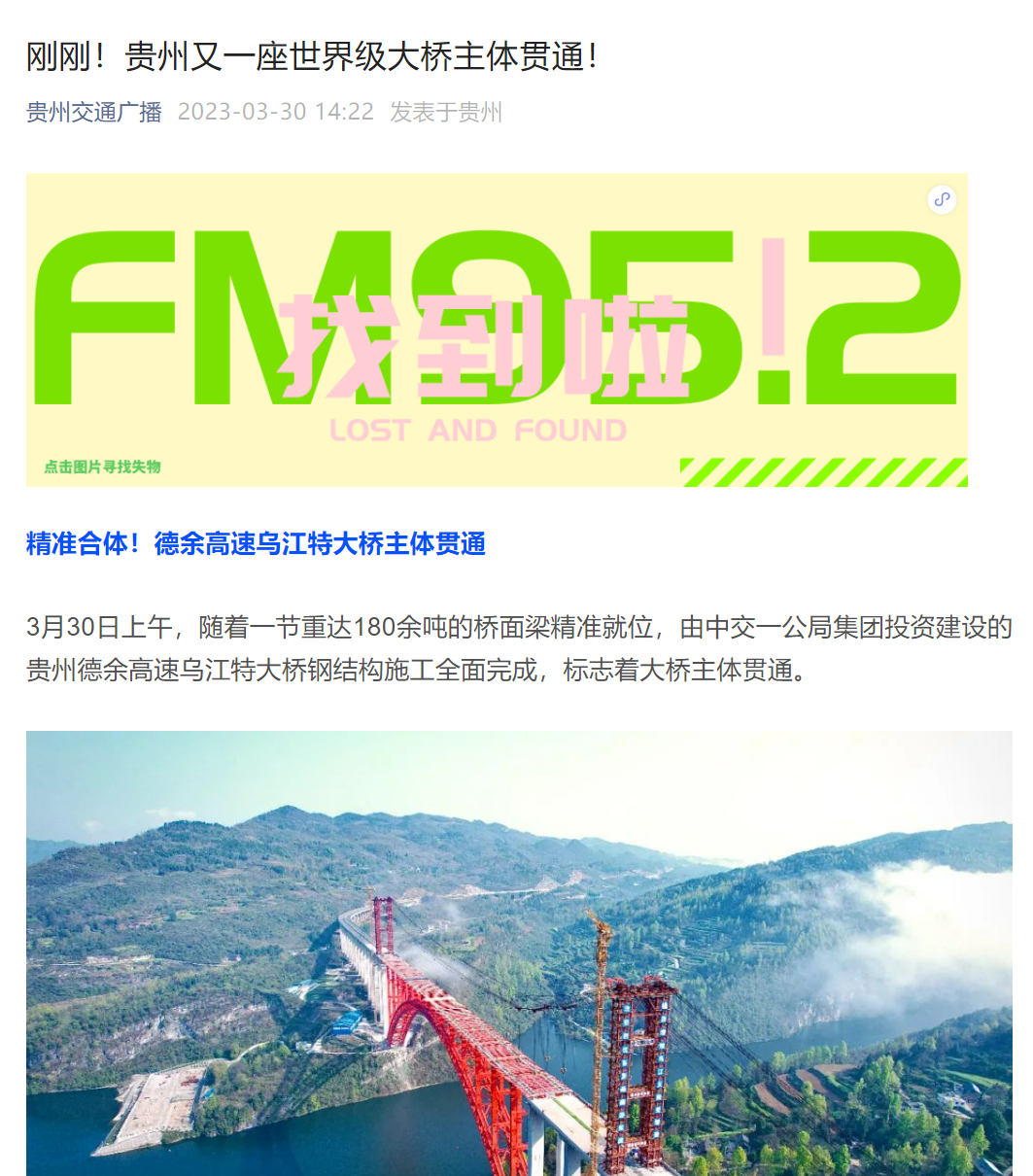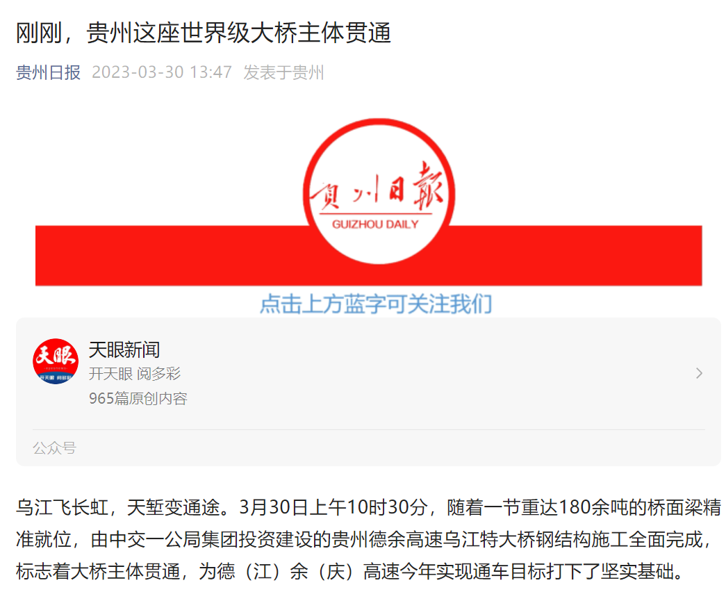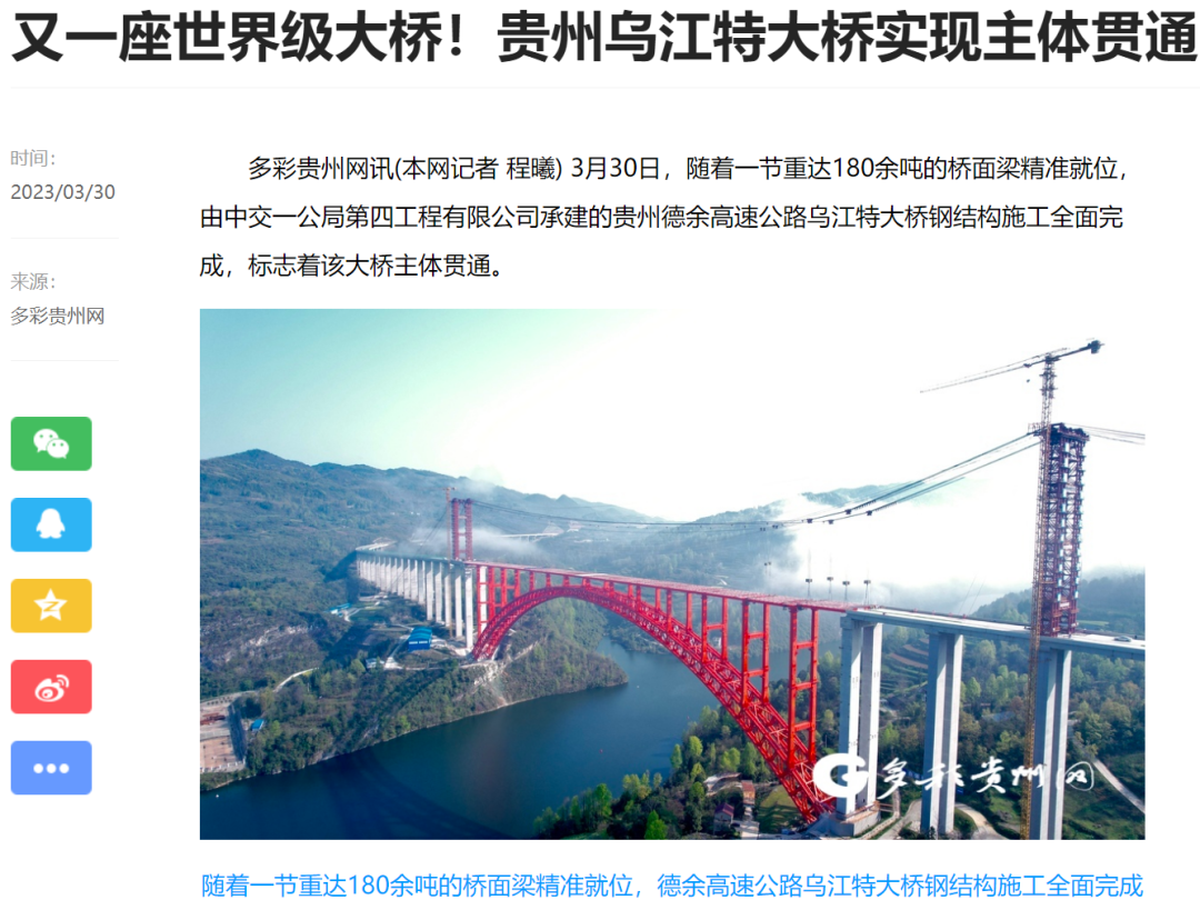 贯通直播共吸引200余万网友围观互动,20余家主流媒体转载乌江特大桥主体贯通消息,中交“出品”的超级工程再次刷屏全网。