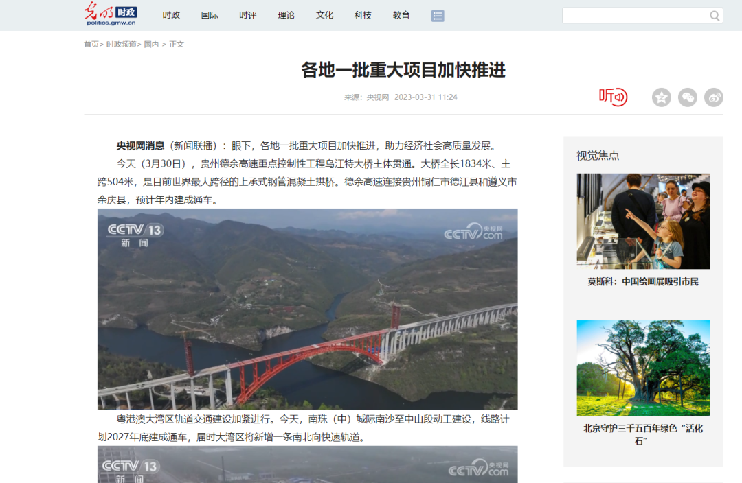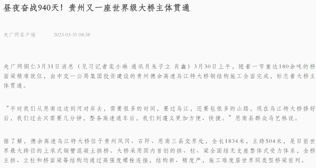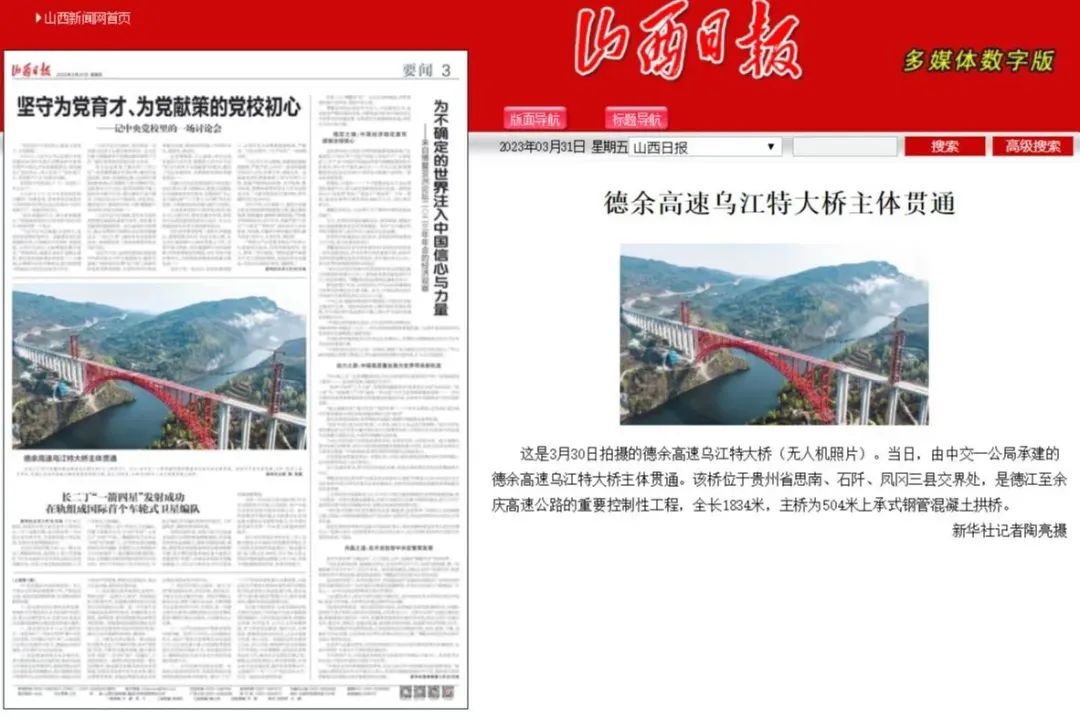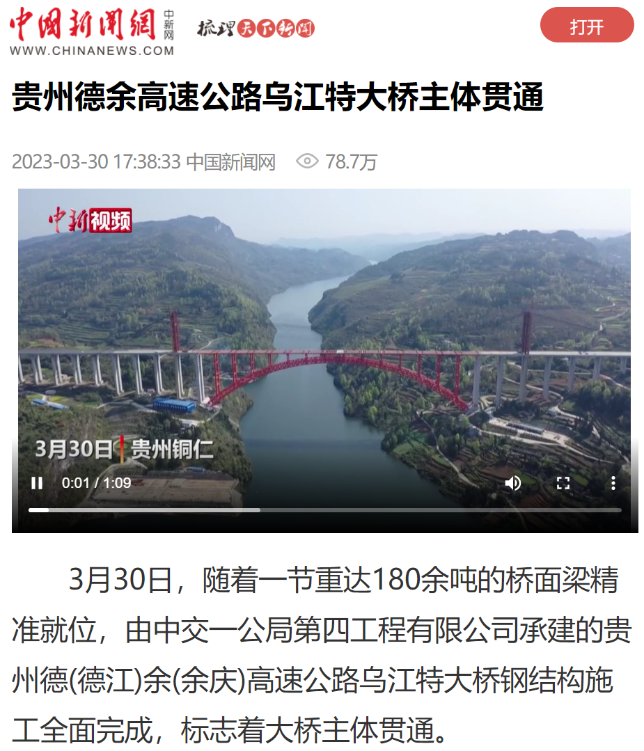 和中央广播电视总台联合主办、一公局集团承办的“交筑·超级工程”暨乌江特大桥主体贯通媒体开放日活动,在贵州德余高速项目现场举办。包括人民日报、新华社、中央广播电视总台、中国新闻社、贵州日报、贵州电视台在内的15家主流媒体走进大桥现场,共同见证和记录这座世界级大桥的贯通时刻。