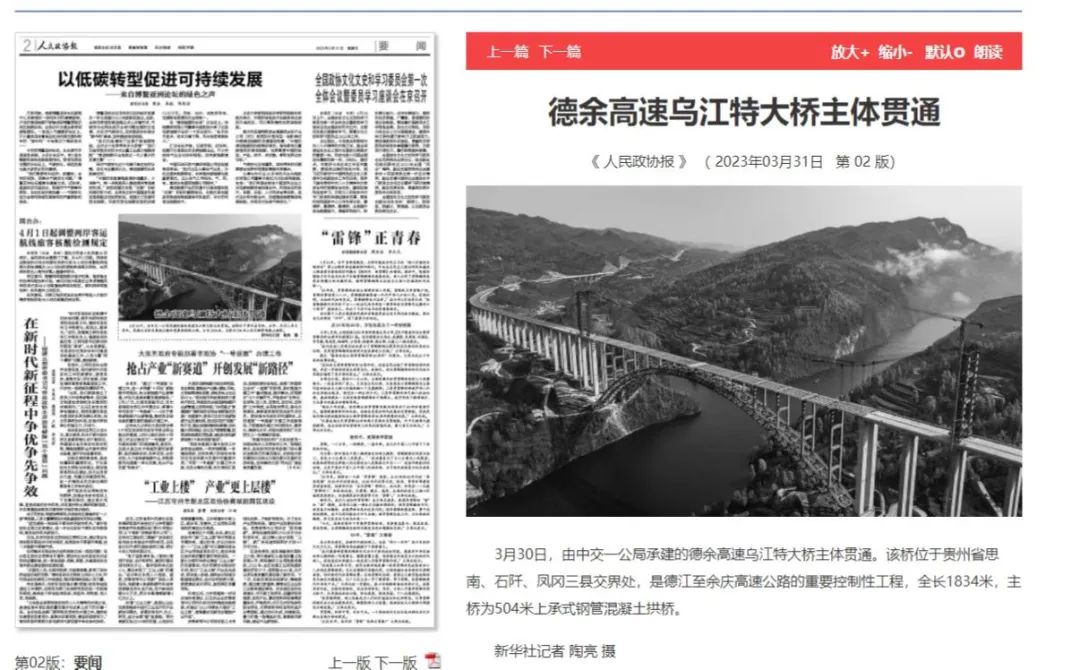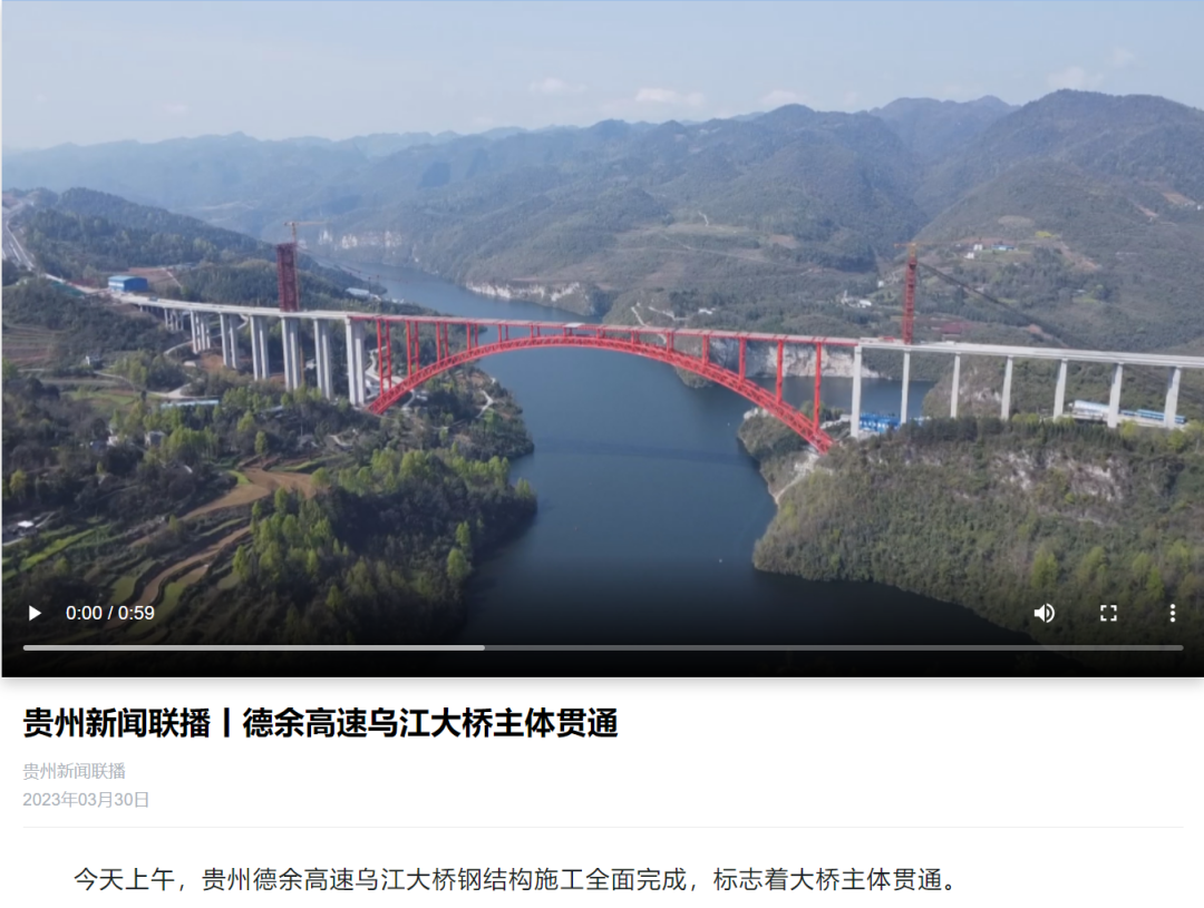 德余高速乌江特大桥全长1834米,主跨504米,是目前世界最大跨径的上承式钢管混凝土拱桥。大桥采用国内首创的拱、柱、梁全固结无支座整体式受力体系,全桥主拱、立柱和桥面梁等结构均通过高强度螺栓连接,结构新、精度严,施工难度居世界同类型桥梁前列。