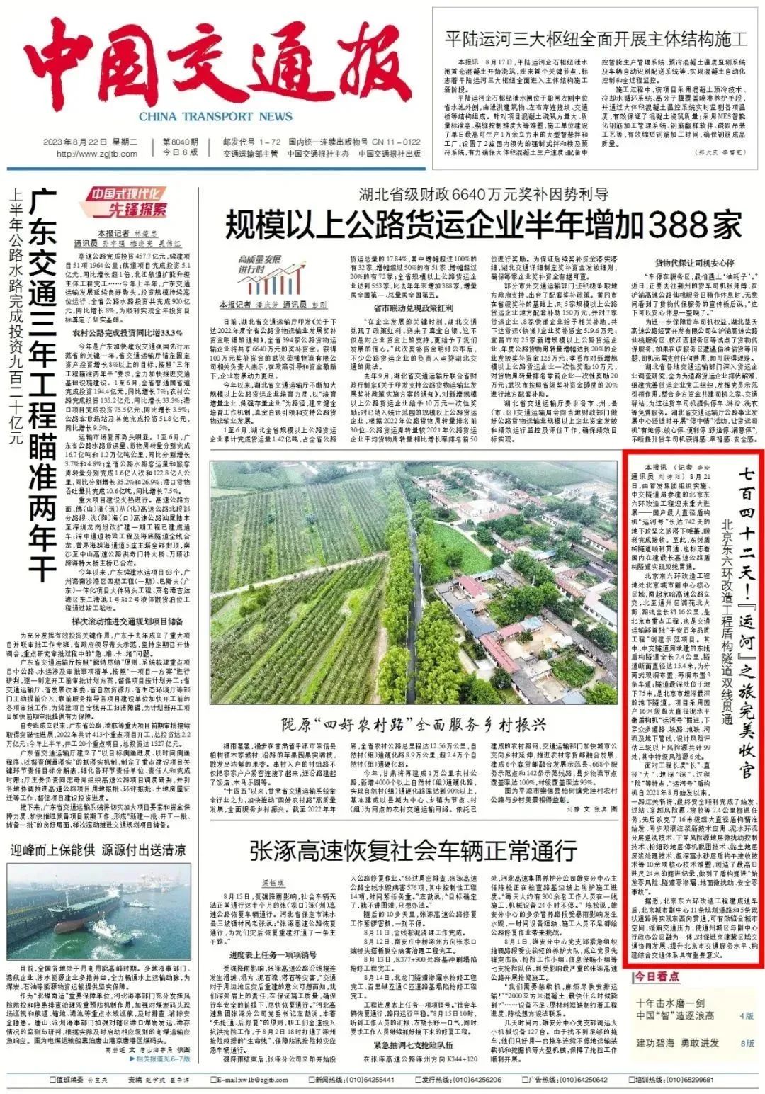 中国交通报头版新闻报道北京东六环改造工程双线贯通。
