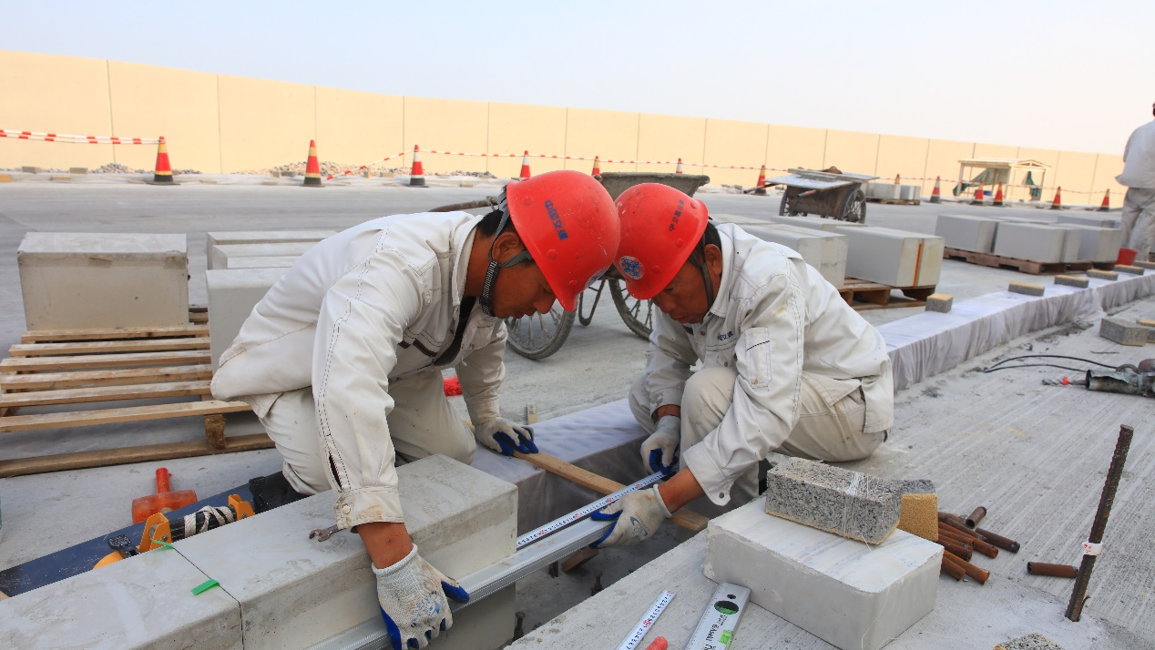 “不行,要求是1毫米,还差一点。”正值一日太阳最毒的时刻,两位工人边安装着路缘石边说着话。为了追求1毫米的精度,他俩把直径1毫米的铁丝夹在两块路缘石中间,安装后铁丝要能紧紧夹在中间,拼缝就得到保障。试验后发现圆型铁丝会滚动,不但会造成缝隙不均匀,而且容易错台,不好固定。“铁丝不行,咱们就用1毫米厚的打包带再试试”,路缘石果然平整地固定在路面,每一块的拼缝不多不少刚好1毫米。工人师傅们就是凭着这种耐心细心,凭着精益求精的一颗匠心,将近5万块小型构件一次次精准地安装在我们的人工岛上和隧道内。